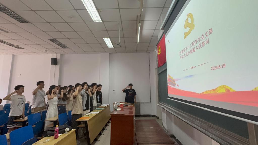 接着,毕业生党员们站在一起,在党旗的见证下,庄重地举起右手,跟随党支部副书记王旭全同志重温并齐声诵读入党誓词。他们将始终坚守党的信仰,恪守党的纪律,为共产主义事业奋斗终身,铿锵有力的誓言回荡在每一个角落,彰显着毕业生们对党的忠诚和对未来的期待。